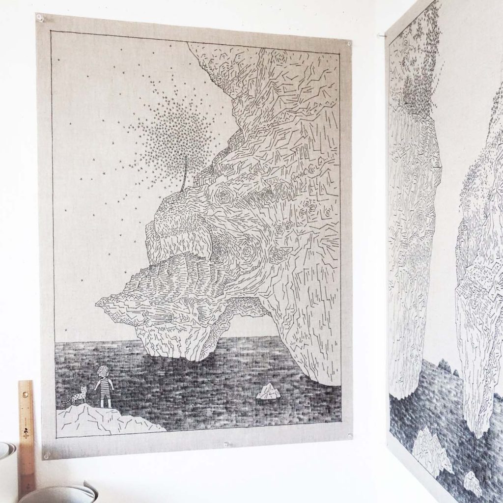 2016年の個展準備中に大きい絵が描きたくなり、試しにマッキーでキャンバスの裏(白いジェッソが塗っていない面)に描いてみたらしっくりきました。このような風景も、このようなスタイルもそれまで描いたことがなく色々謎で驚きました。葉っぱが受けている風を自分も感じながらひとつひとつ線や点を描き加えていくと、とても楽しく、安らかな気持ちになります。まるで旅をしているかのように、絵の世界を旅して頂けたらとてもうれしいです。