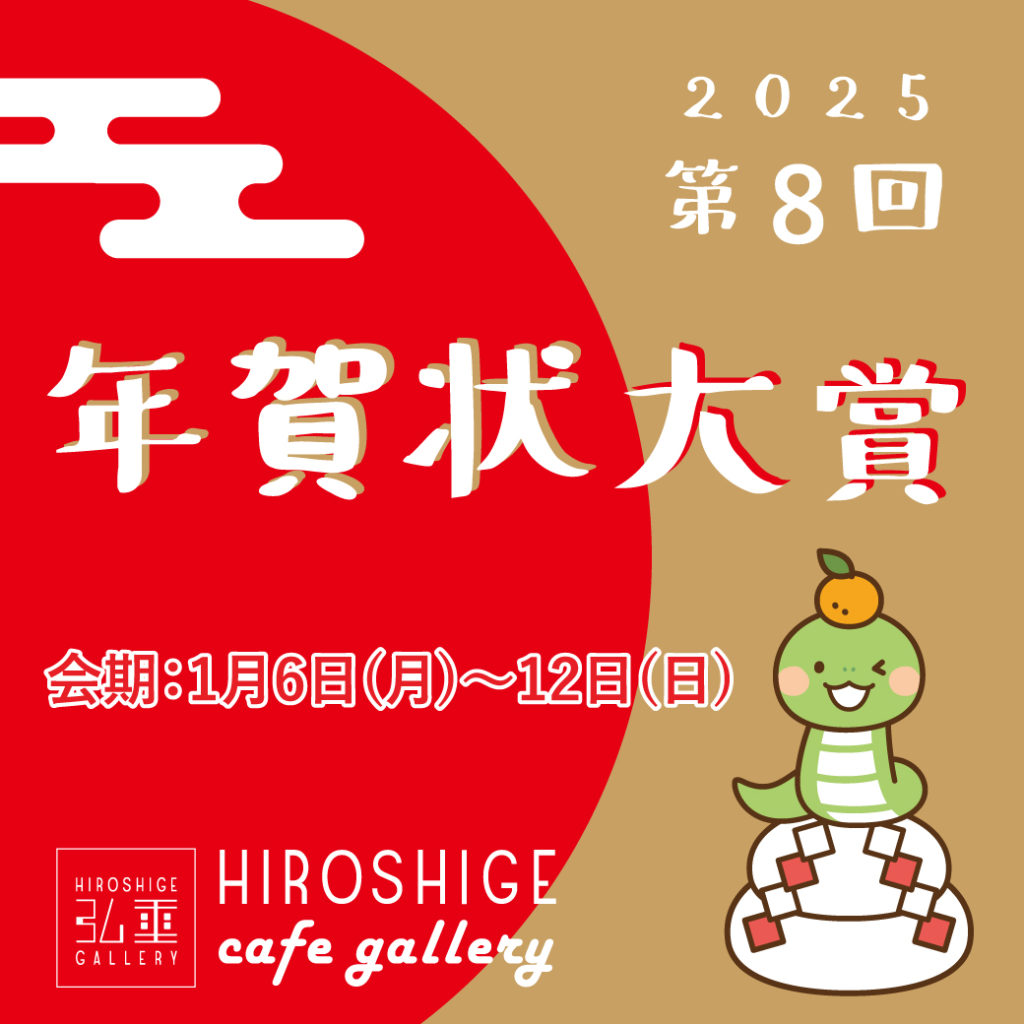 来場者の1票で2025年「巳」の年賀状大賞が決まるギャラリーに郵送してくれれば展示しますよ!どなたでも参加OK!参加無料!1月5日(日)までに着くように郵送してください。送っていただいた年賀状をギャラリーに展示します!会期始まってからの到着分も、どんどん追加展示していくよ【郵送先】〒150-0022渋谷区恵比寿南2-10-4弘重ギャラリー「年賀状大賞」宛皆様からの年賀状お待ちしています!