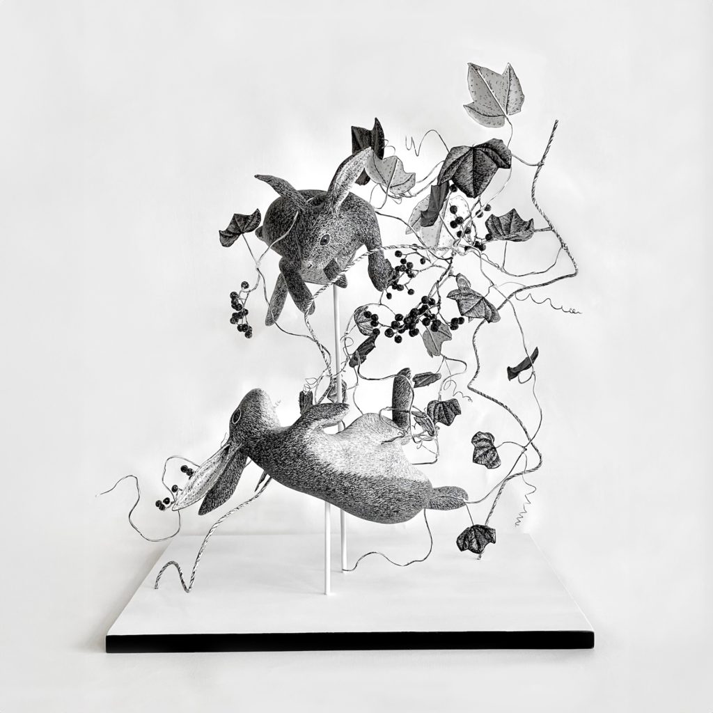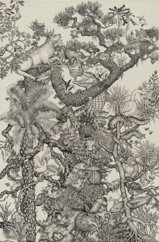 モノクロのペンを用い、動植物を細密に表現する村山。幼少期を過ごした山村で自然の豊かさ・動植物の多様性に触れ、そこにいる生きものたちを細部まで表現したいと思い、ペン画に取り組み始めます。