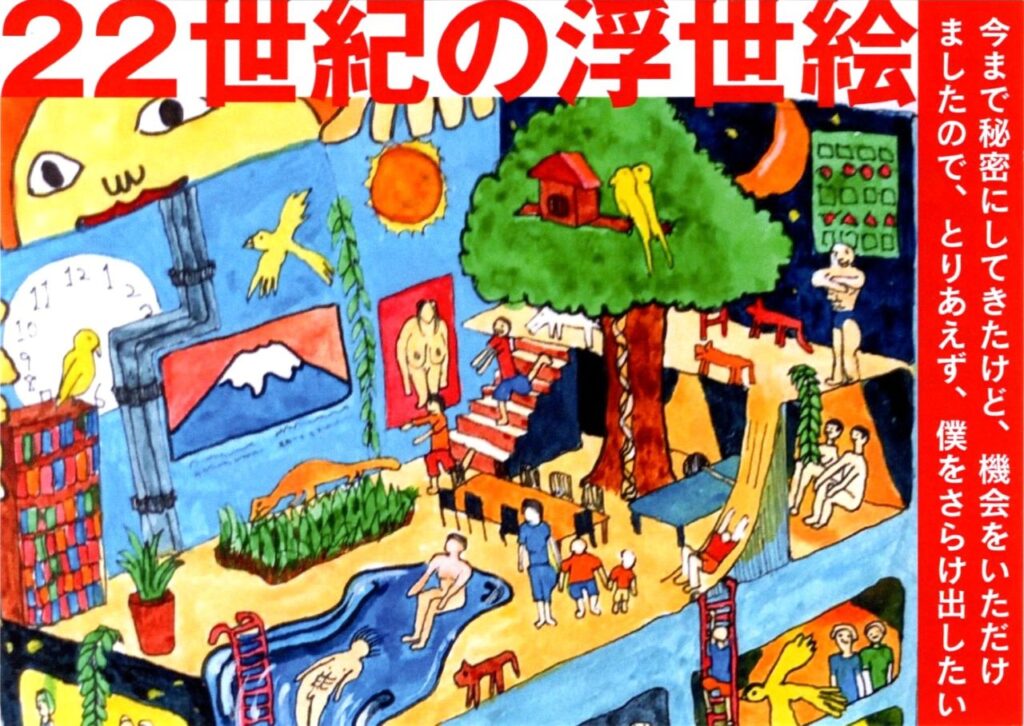 22世紀の浮世絵をテーマに、「この世界、ちょっとヘンで面白い。」街角や野良猫、銭湯など、何気ない日常を自分の頭で再構築。「今まで秘密にしてきたけど、機会をいただけましたので、とりあえず僕をさらけ出したい」――その想いを込めて。