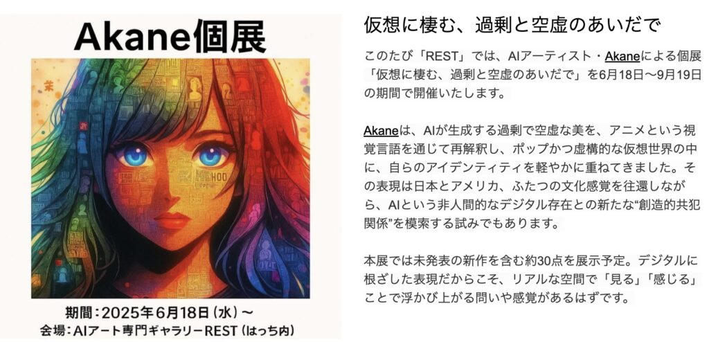 このたび「REST」では、AIアーティスト・Akaneによる個展「仮想に棲む、過剰と空虚のあいだで」を6月18日〜9月19日の期間で開催いたします。