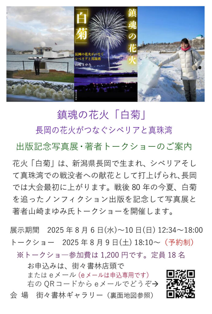 戦後80年の今夏に出版された『鎮魂の花火「白菊」 長岡の花火がつなぐシベリアと真珠湾』を記念して、東京都武蔵野市吉祥寺の本屋街々書林ギャラリーにて開催します。