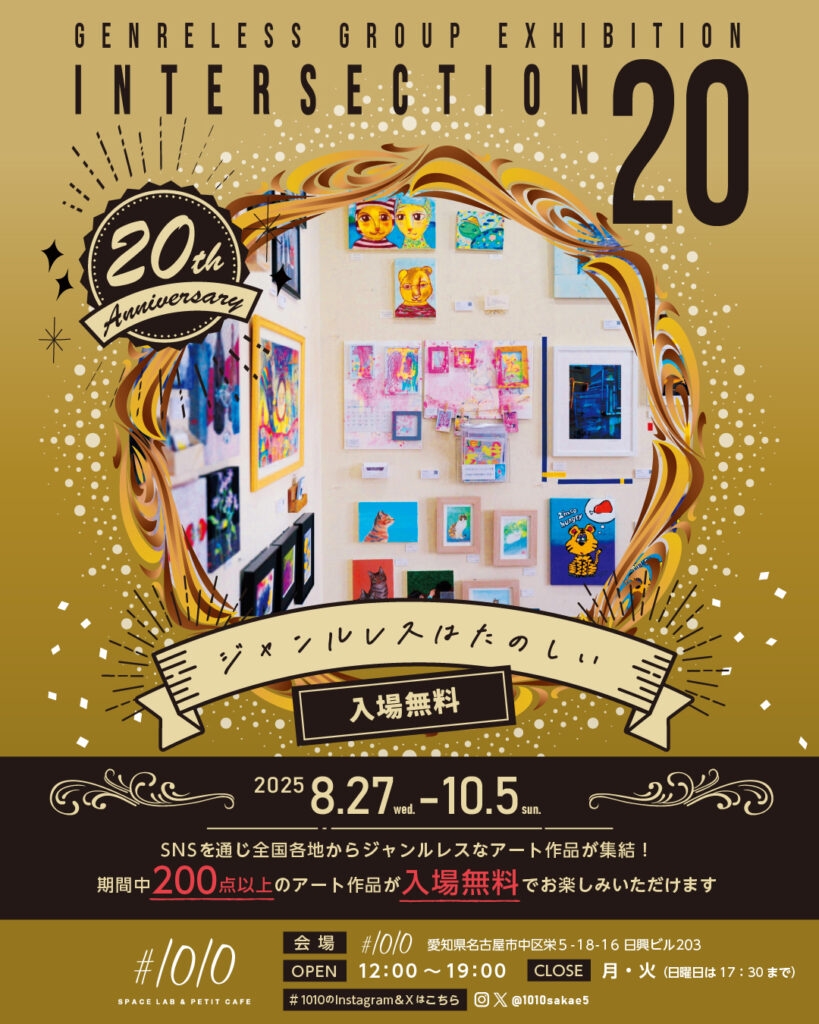 アートギャラリー「#1010」(所在地:愛知県名古屋市中区、代表:杉野恭幸)は、2025年8月27日(水)から10月5日(日)までの期間、ジャンルレスグループ展「intersection 20」を開催いたします。