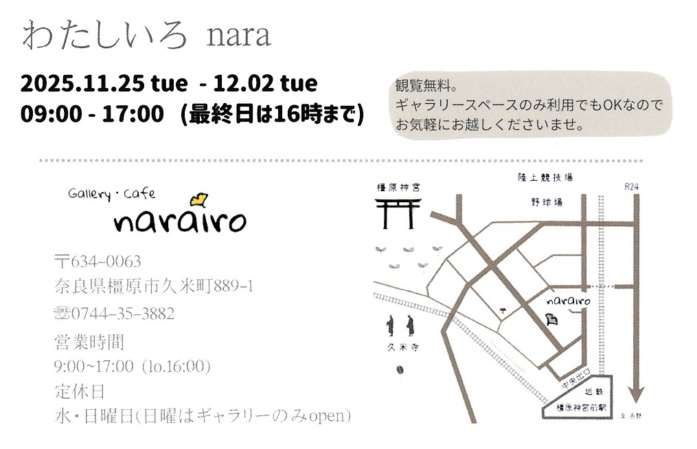 - 2025.11.25 - 2025.12.02「わたしいろ nara」ai個展 11/25(火)~12/2(火)