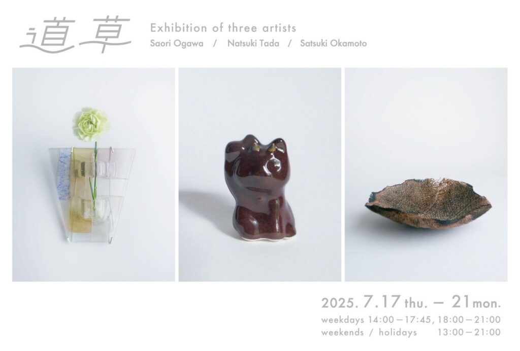 小川沙織(ガラス)・多田夏樹(陶芸)・岡本沙津希(染色•漆)の三人展。