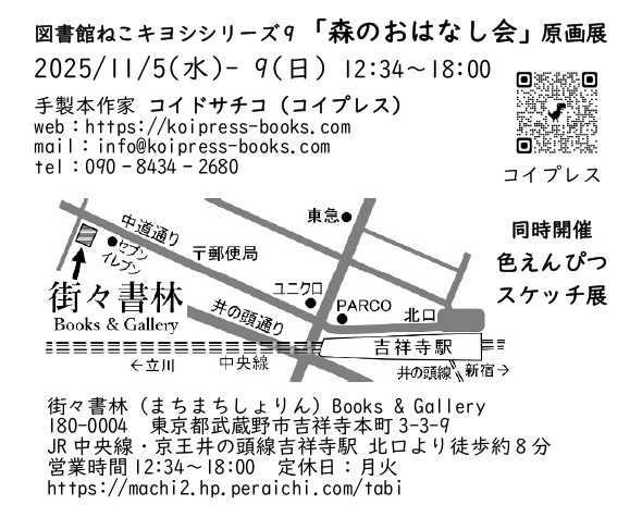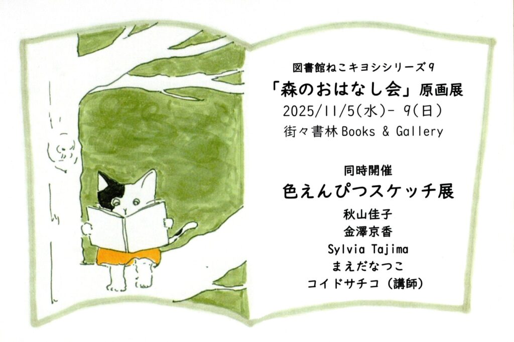 - 2025.11.05 - 2025.11.09手製本作家 コイドサチコ個展 図書館ねこキヨシシリーズ9「森のおはなし会」原画展 同時開催 色えんぴつスケッチ展