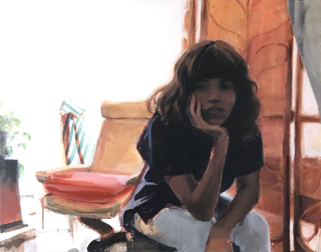 小木曽が主に描くのは自身の家族やその周辺の風景です。落ち着いた色彩を組み合わせて描かれる絵画空間からは対象の存在感が浮かび上がってきます。