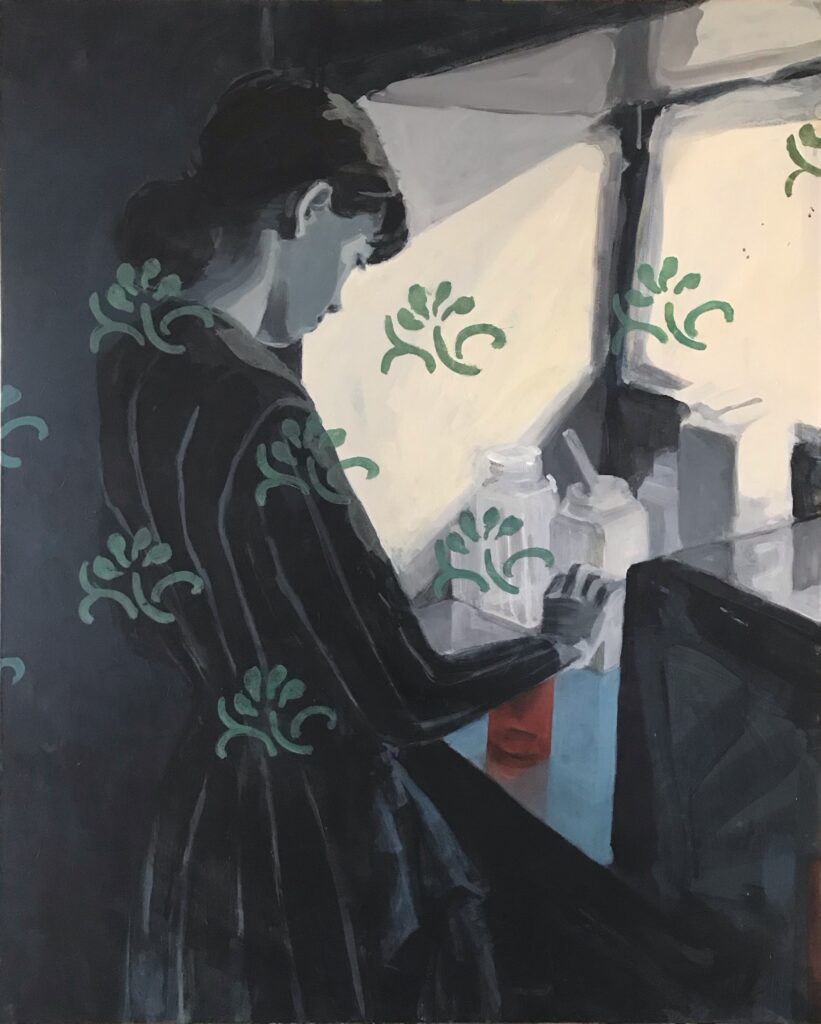 武蔵野美術大学で油画を専攻した小木曽。大学院修了後、結婚・育児のためしばらく制作から離れていましたが、近年ふたたび筆をとり始めました。旺盛な制作意欲と、大胆な筆さばきはブランクを感じさせません。