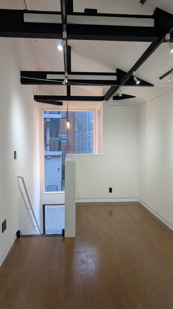 | 設備/備品など | 木製フローリング Wood Flooring 螺旋階段 Spiral Staircase Wi-Fi (無線LAN) Wi-Fi テーブル Table x2 トイレ(男女共用) Toilet 流し台 Sink 椅子 Seats イーゼル Easels x8 防犯カメラ CCTV パーテーション Partitions |
